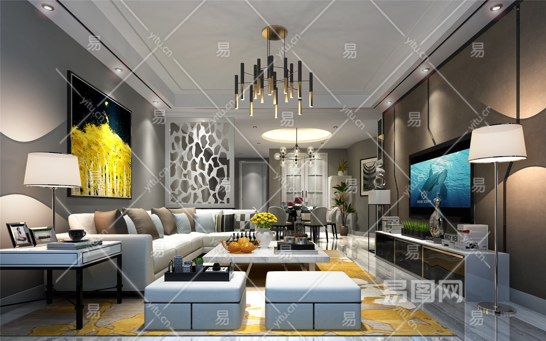 现代客厅 餐厅 画 沙发组合 吊灯 台灯 摆件