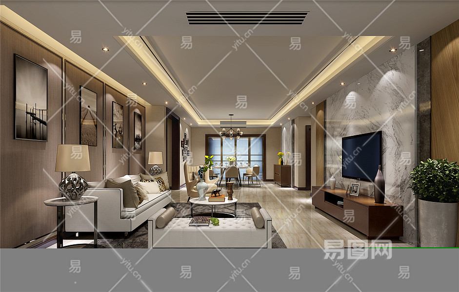 现代客厅 餐厅 画 沙发组合 吊灯 边柜