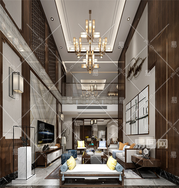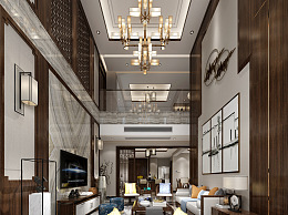 新中式别墅客餐厅 吊灯 壁灯 墙饰雕塑 电视柜 沙发茶几 餐桌椅