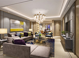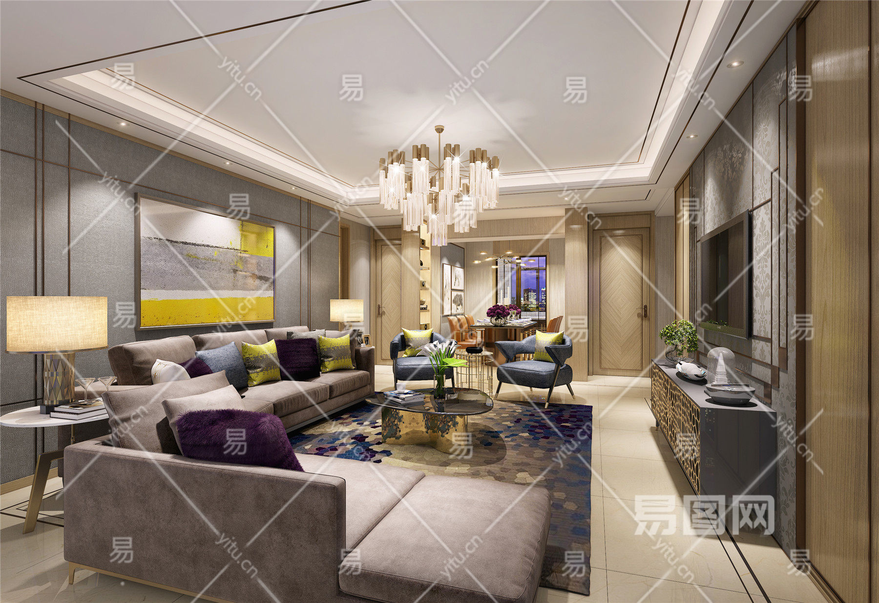 现代现在客餐厅 沙发 茶几 地毯 吊灯 电视柜 餐桌椅 挂画