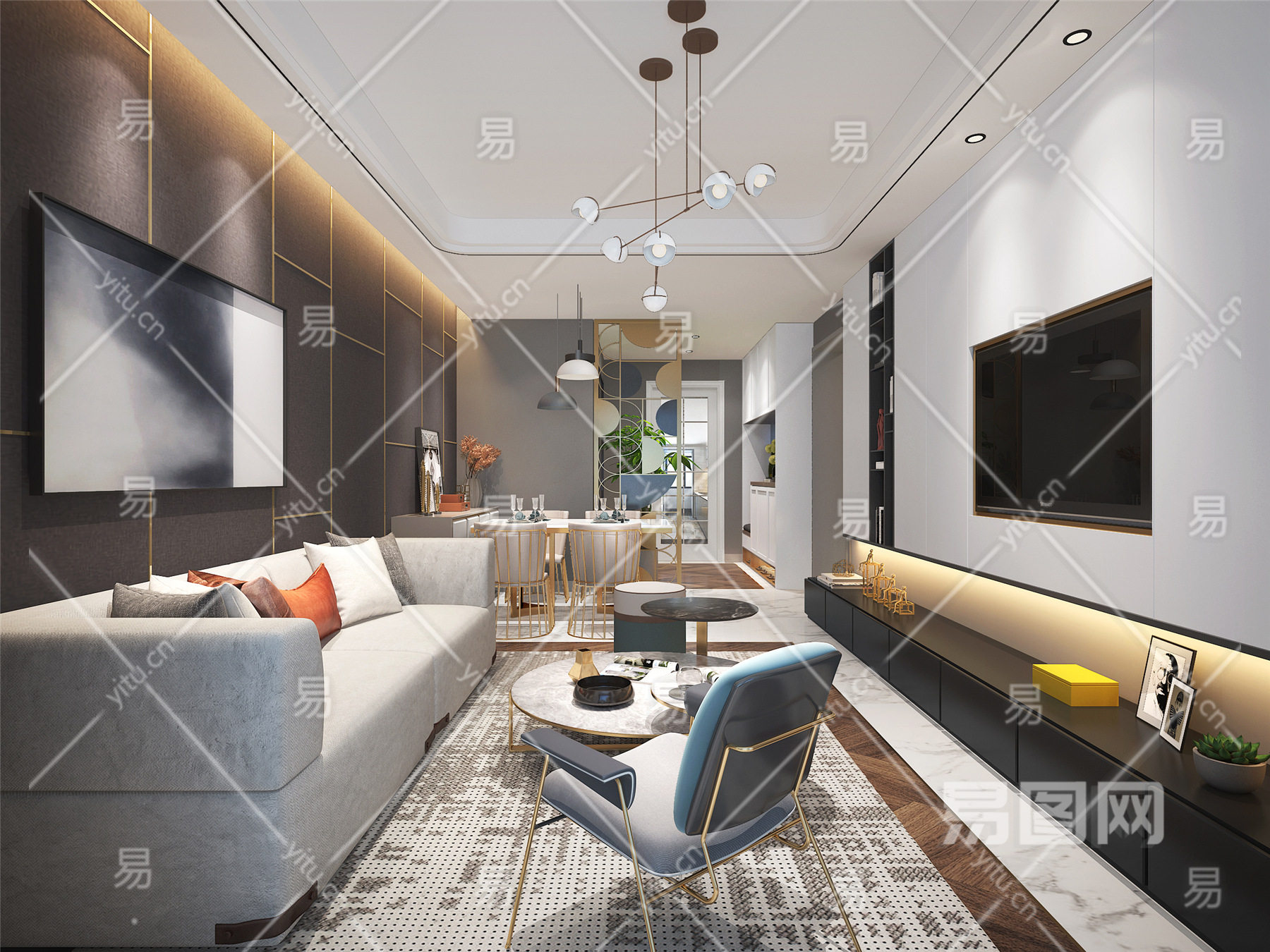 现代轻奢客餐厅 背景墙 餐桌椅 沙发茶几 金属隔断 吊灯摆件