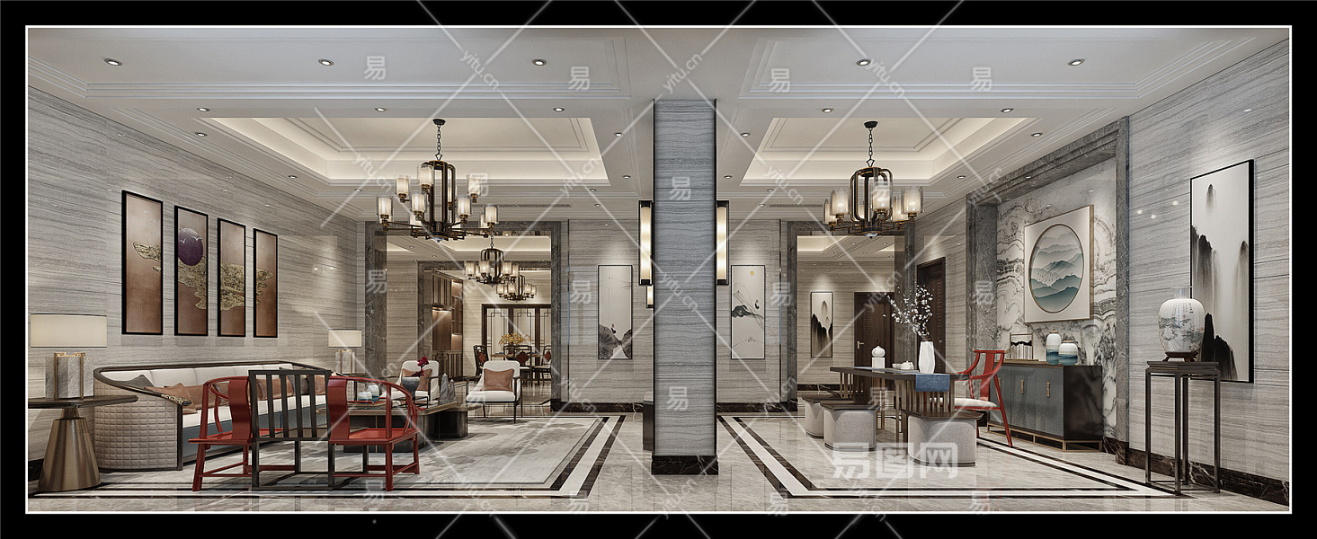 新中式客餐厅 吊灯台灯 餐桌椅 雕塑摆件 沙发 茶几 壁灯 花瓶