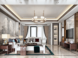 新中式客餐厅 沙发 桌椅组合 背景墙