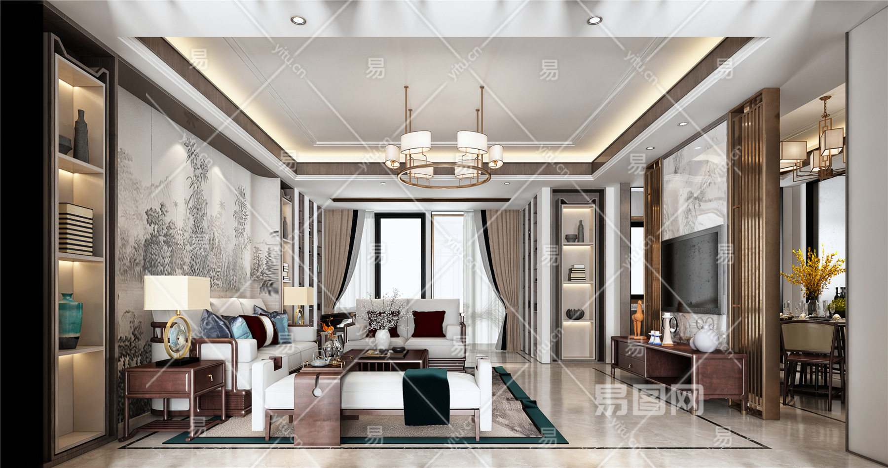 当前的位置:首页 > 3D模型 > 家装空间 > 客餐厅 > 新中式客餐厅 沙发 桌椅组合 背景墙