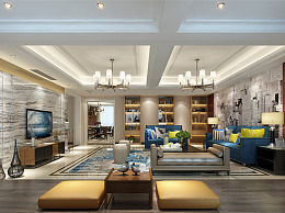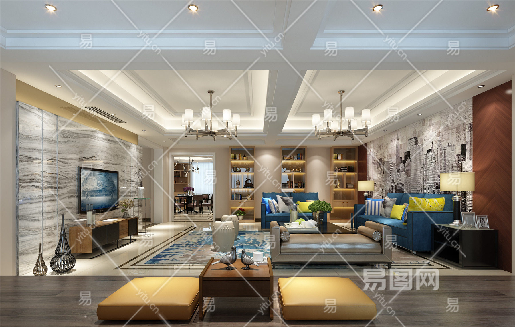 新中式客餐厅 沙发茶几 吊灯 桌面摆件 挂画 电视柜 地毯 餐桌椅