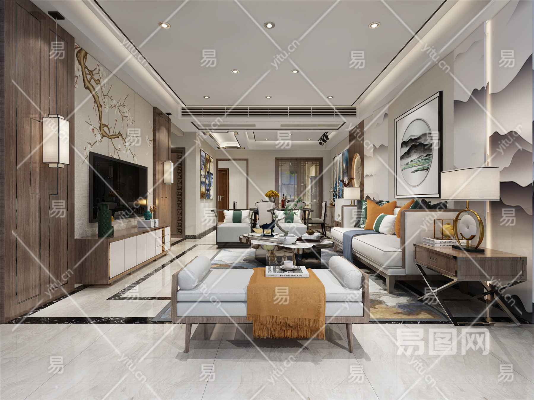 新中式客餐厅 电视柜 餐桌椅 绿植雕塑 沙发 茶几 挂画