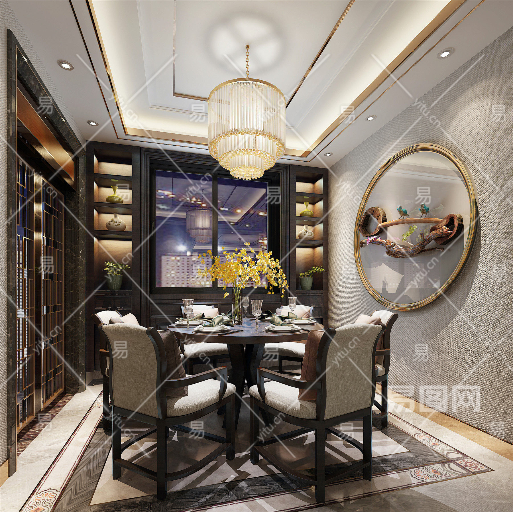 传统中式餐厅 餐桌 餐椅 餐边柜 吊灯 挂画