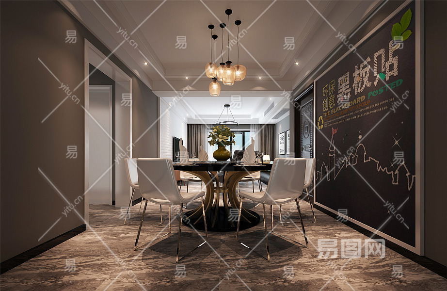 现代餐厅 餐桌 餐椅 餐边柜 吊灯 挂画-10