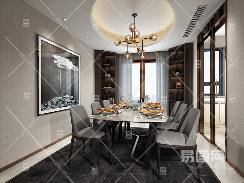 当前的位置:首页 > 3D模型 > 家装空间 > 客餐厅 > 现代家居餐厅 吊灯 酒柜 餐桌椅 餐具 挂画