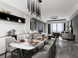 现代客餐厅 吊灯 挂画 沙发 茶几 餐桌椅