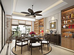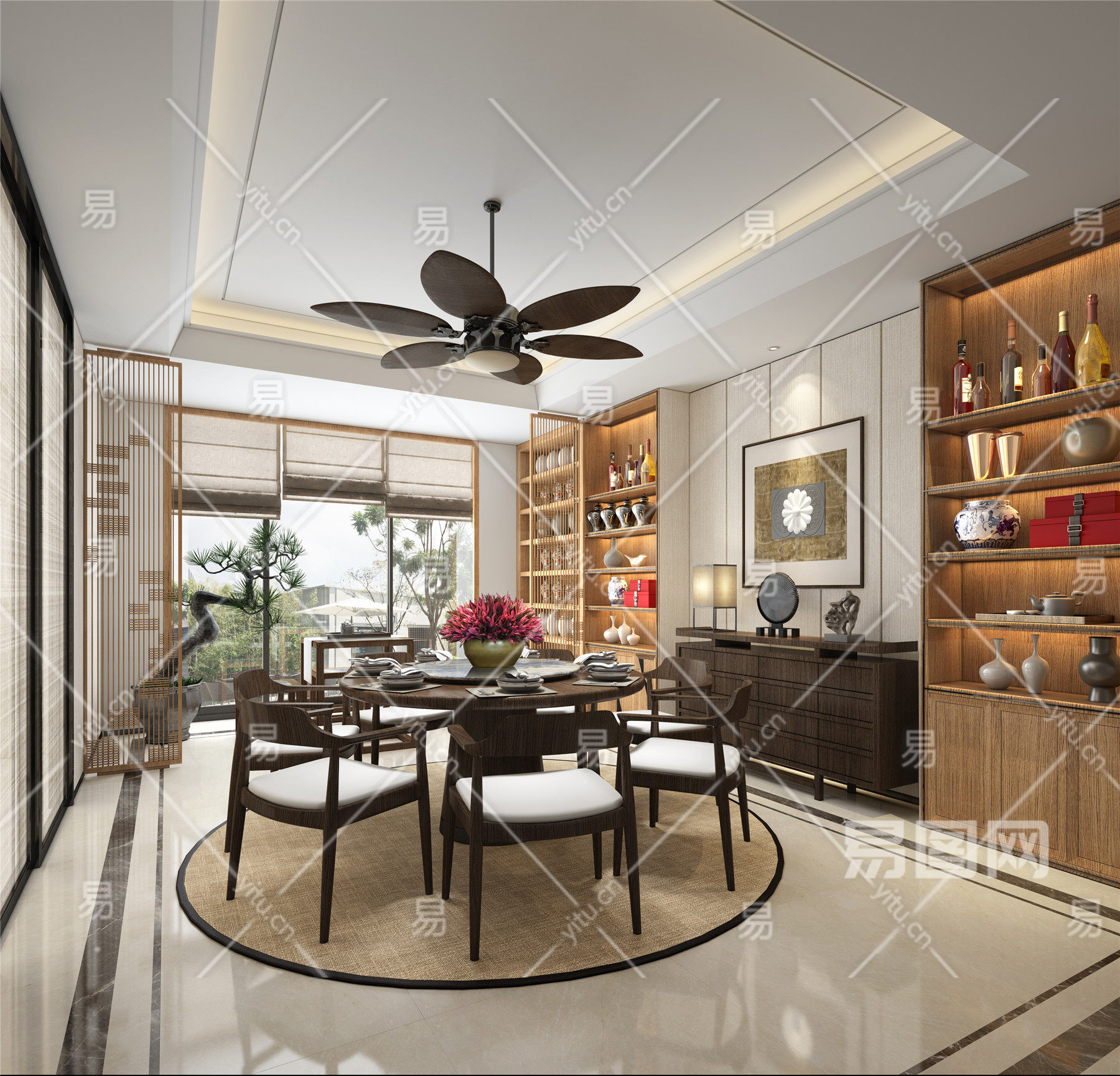 中式餐厅圆形餐桌椅风扇吊灯组合