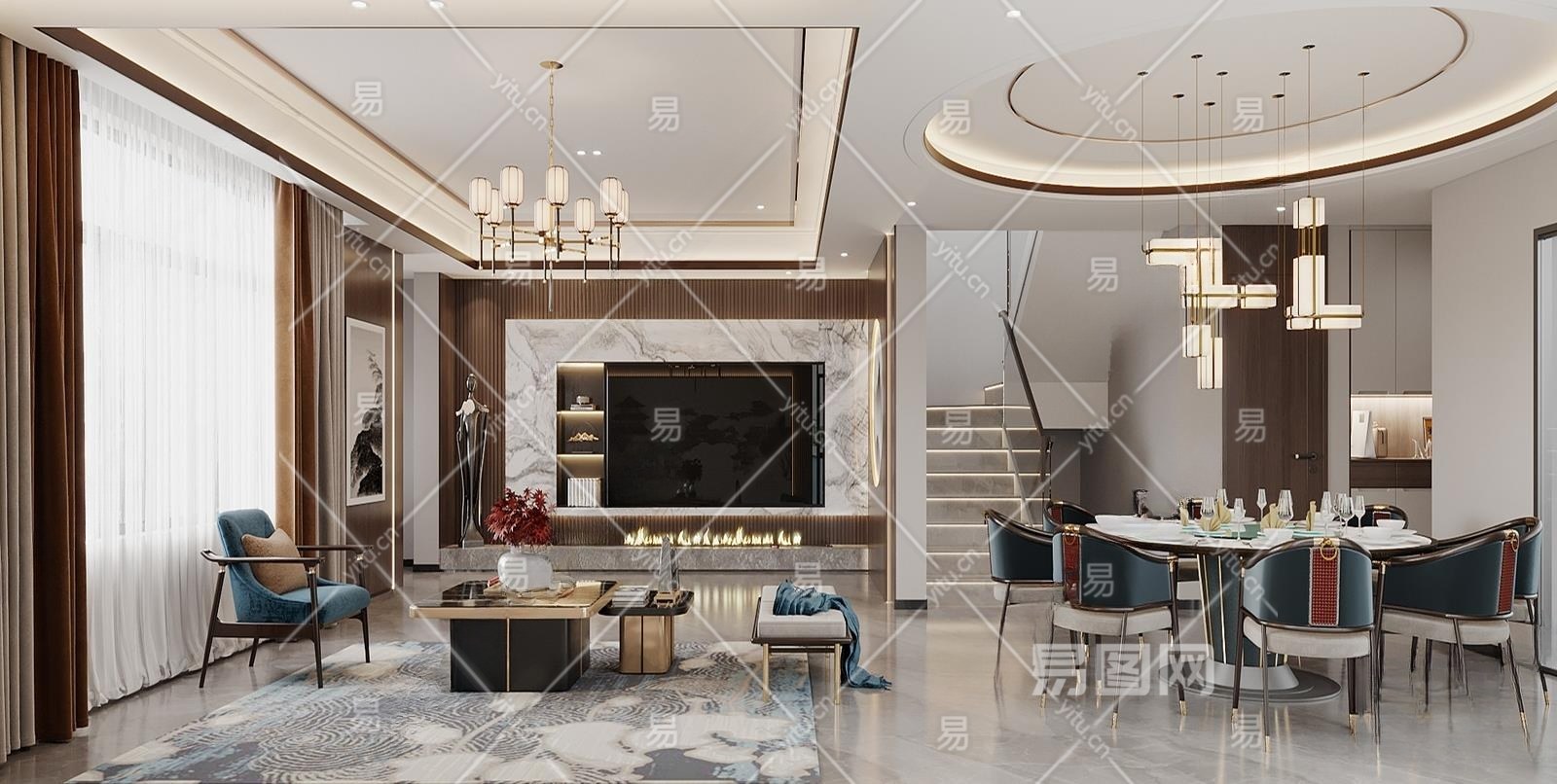 新中式别墅客厅3D模型下载