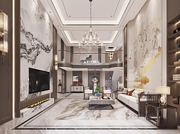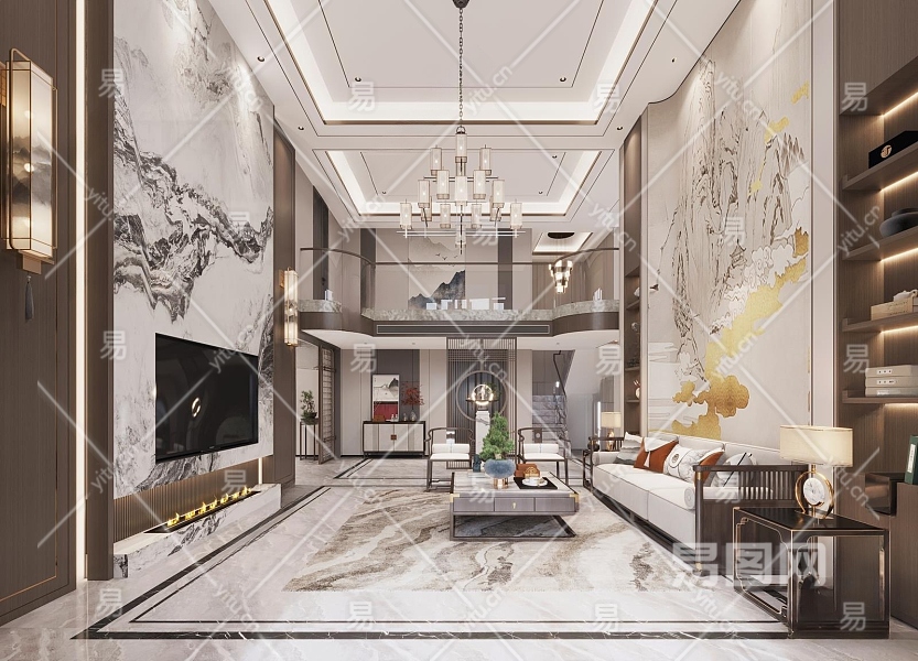 新中式挑高别墅客厅3D模型下载