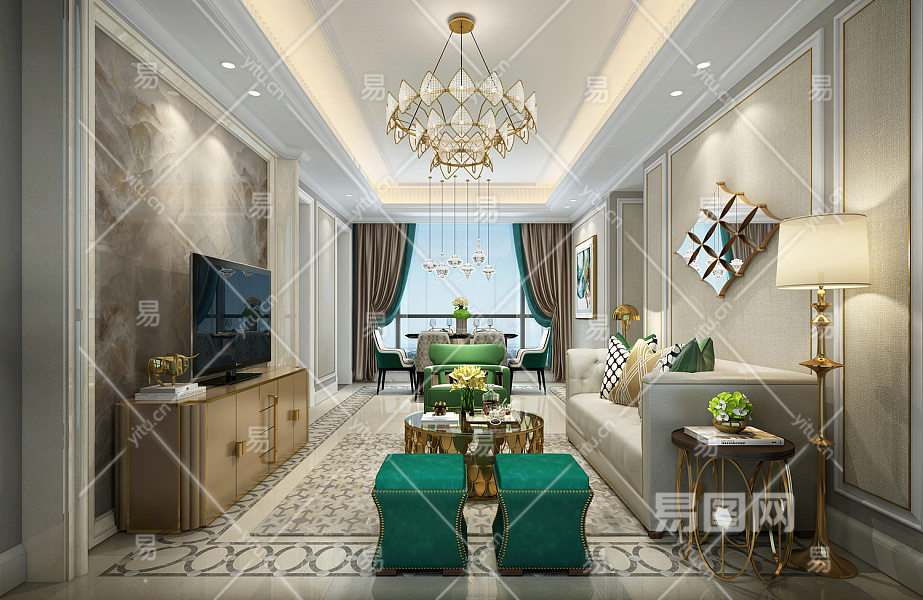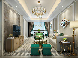 后现代轻奢 沙发茶几组合 水晶吊灯 窗帘 落地灯