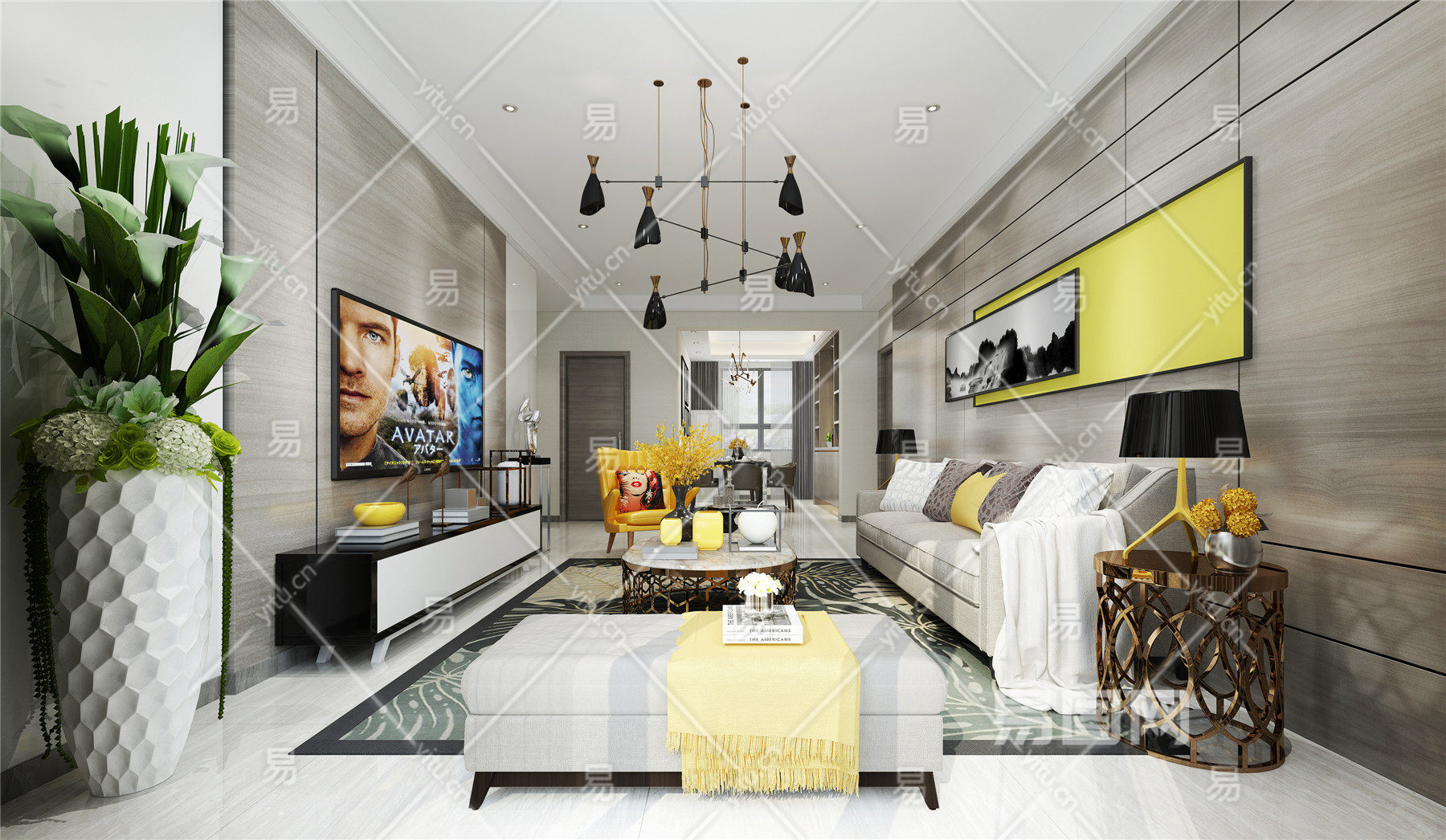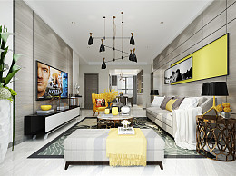 现代简约客厅 沙发 落地灯 茶几 地毯 电视柜 挂画-1