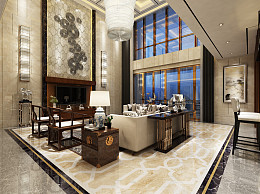 新中式复式客厅 沙发组合 吊灯 壁灯 台灯 摆件