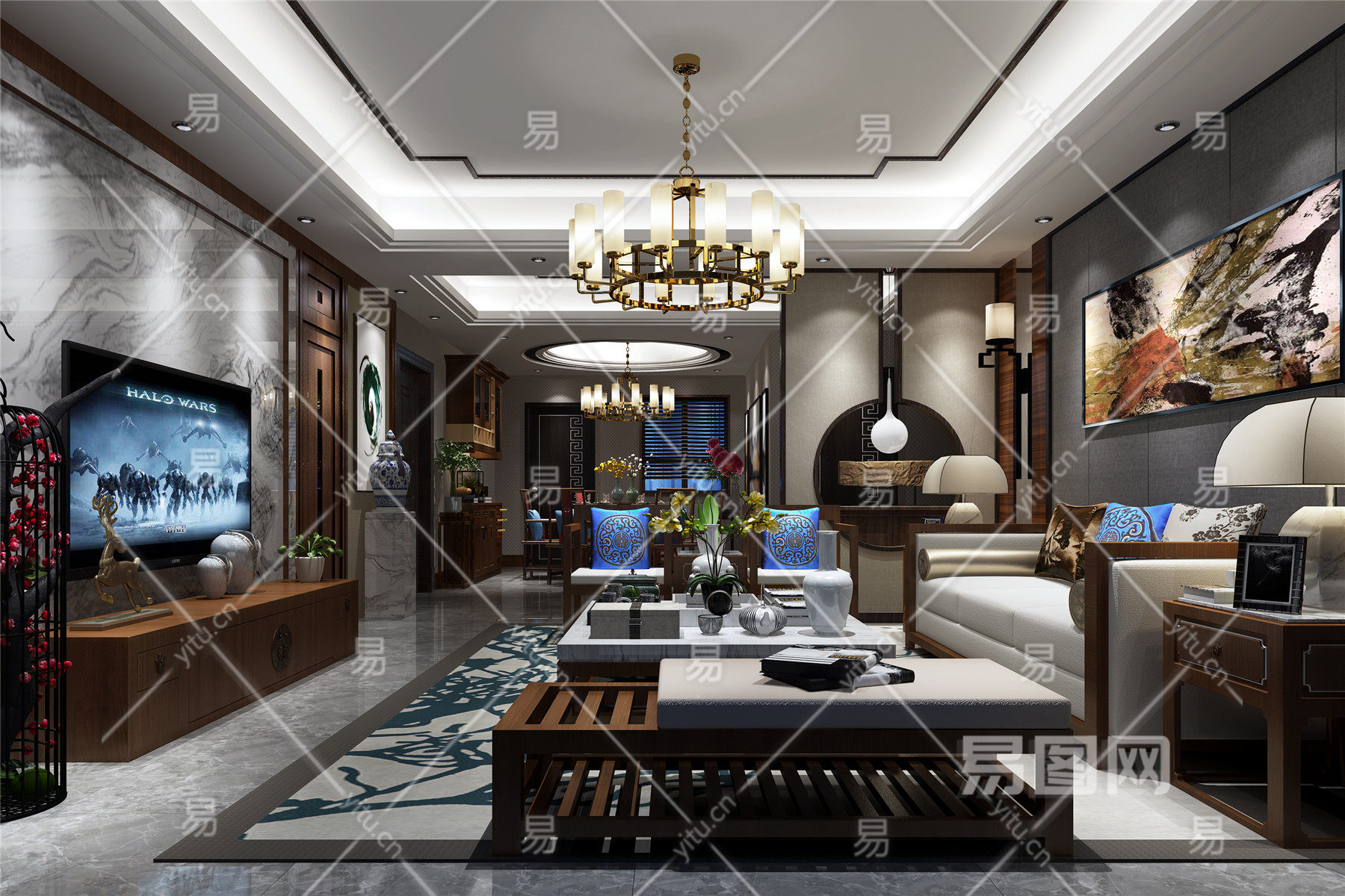 新中式客厅 餐桌 中式画 中式沙发组合 电视柜
