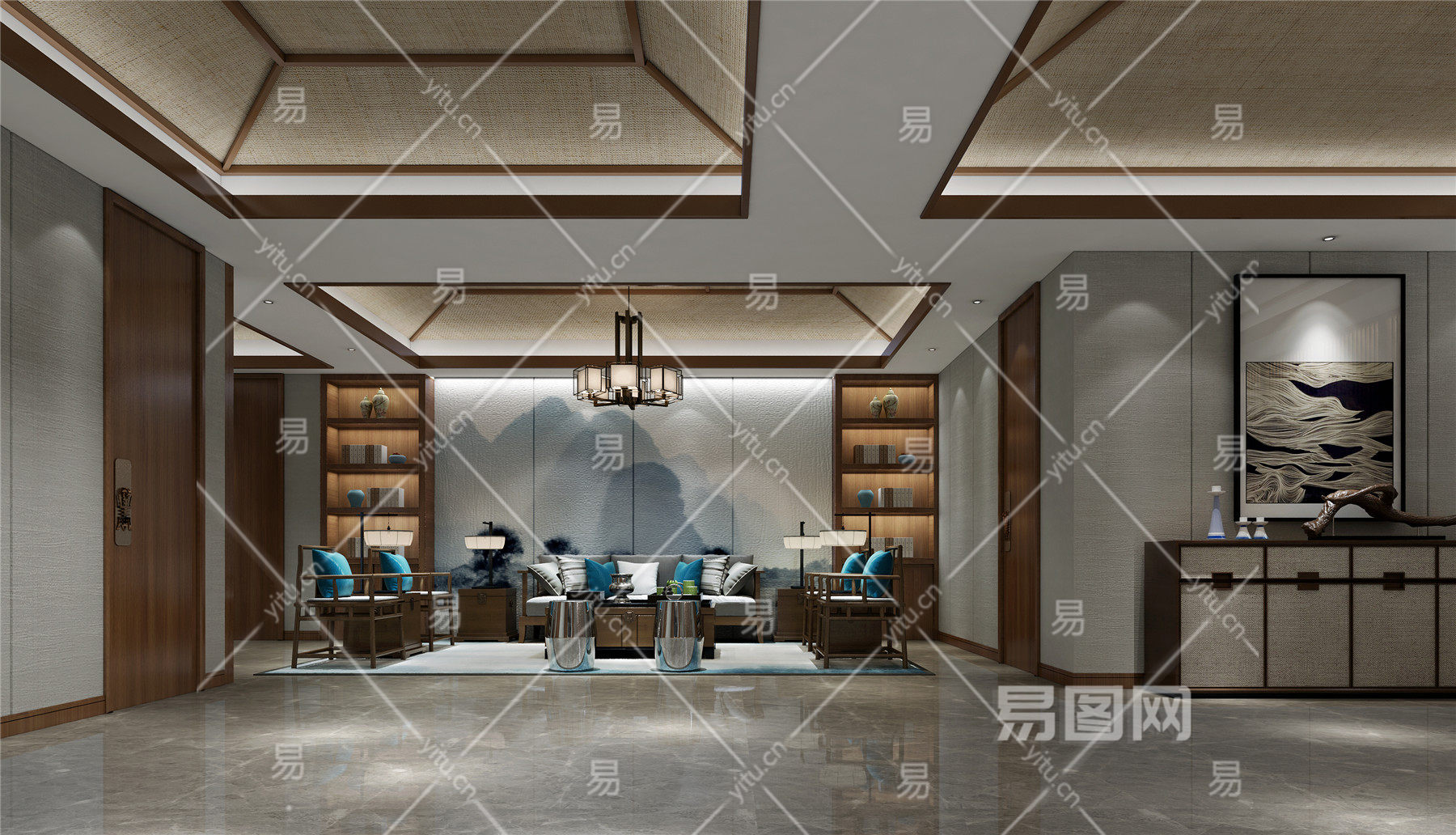 新中式客厅 吊灯 边柜 沙发茶几 桌面摆件 挂画 电视柜 地毯
