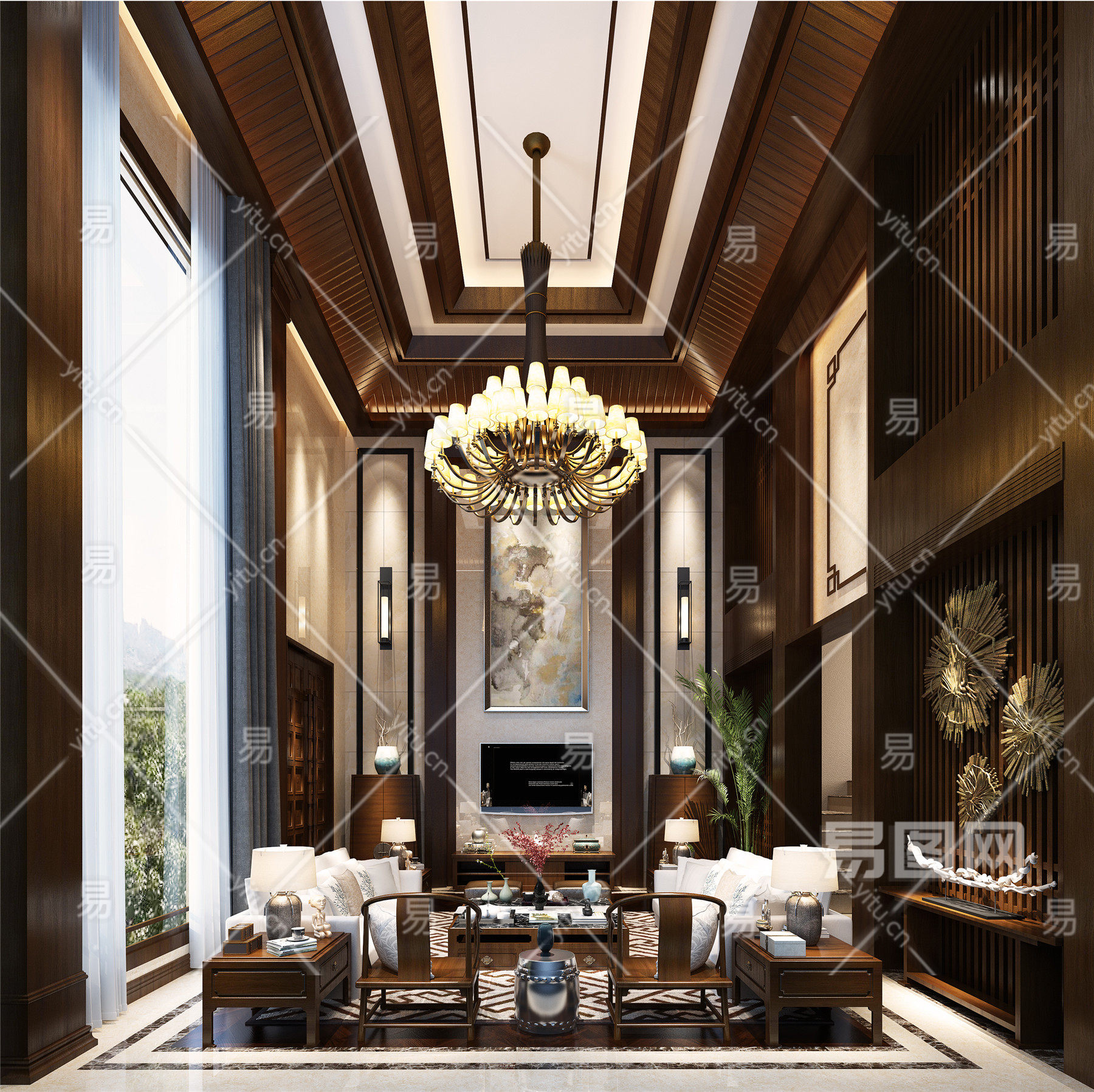 新中式客厅 沙发 背景墙 窗帘 灯具 栏杆