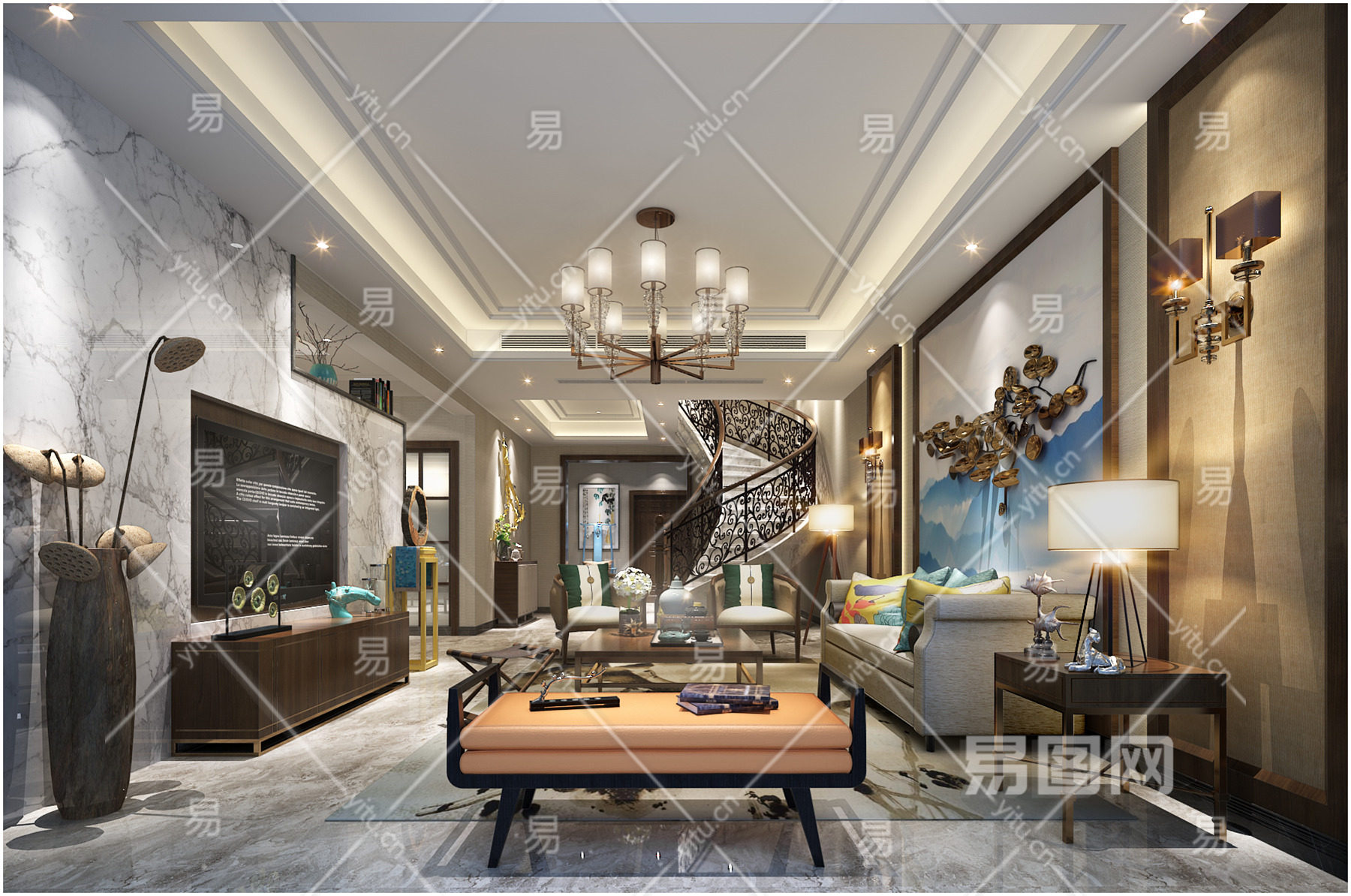 新中式客厅 沙发组合 吊灯 壁灯摆件