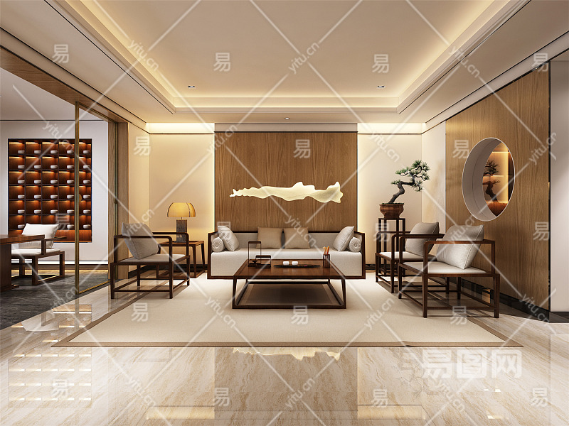 新中式客厅 沙发茶几组合 背景墙 端景盆栽