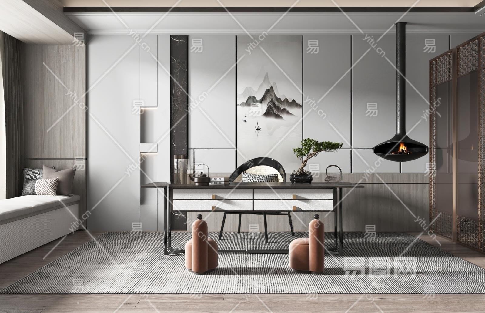 新中式家居书房3D模型下载