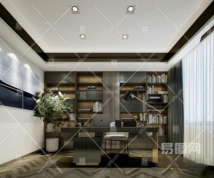 现代书房 书桌椅组合 书柜 植物 摆件 窗帘 挂画