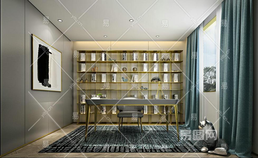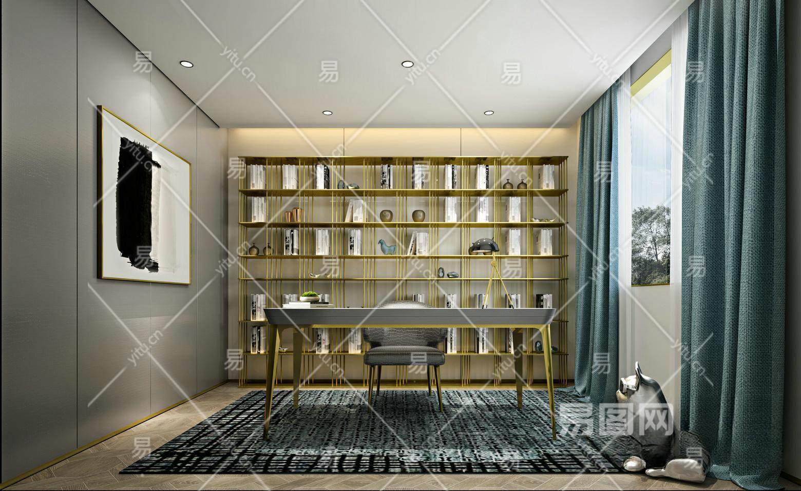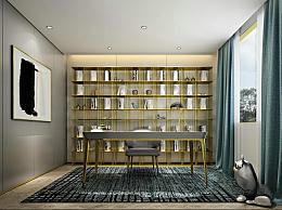现代书房 挂画 书柜 书桌椅组合 窗帘 摆件
