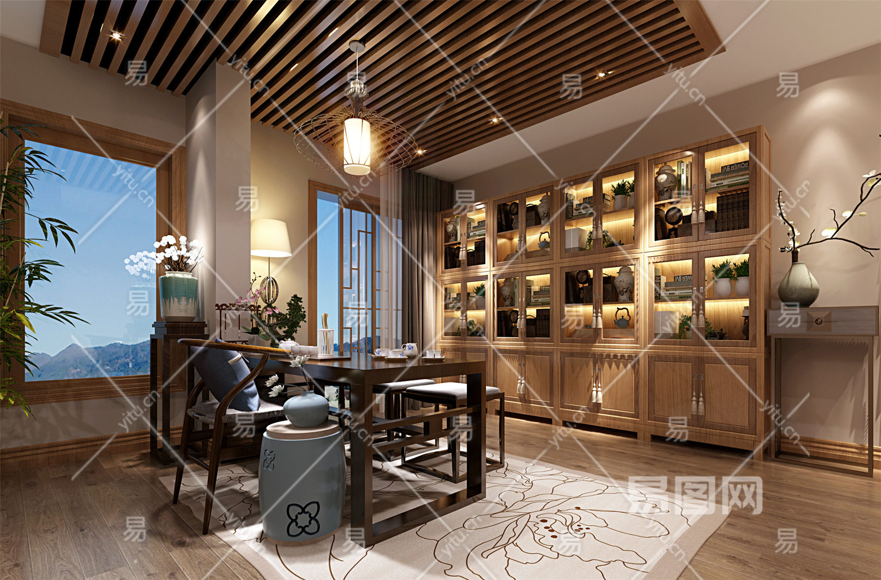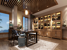 中式书房 中式书柜 木格栅吊顶 中式地毯 中式摆件