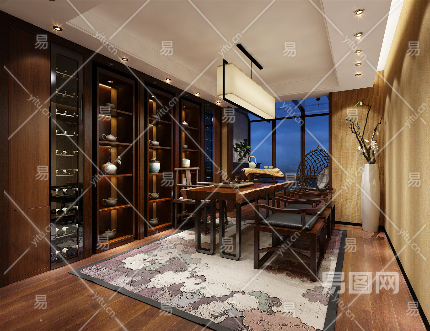 新中式书房茶具茶室 置物架 书桌椅 吊灯 摆件