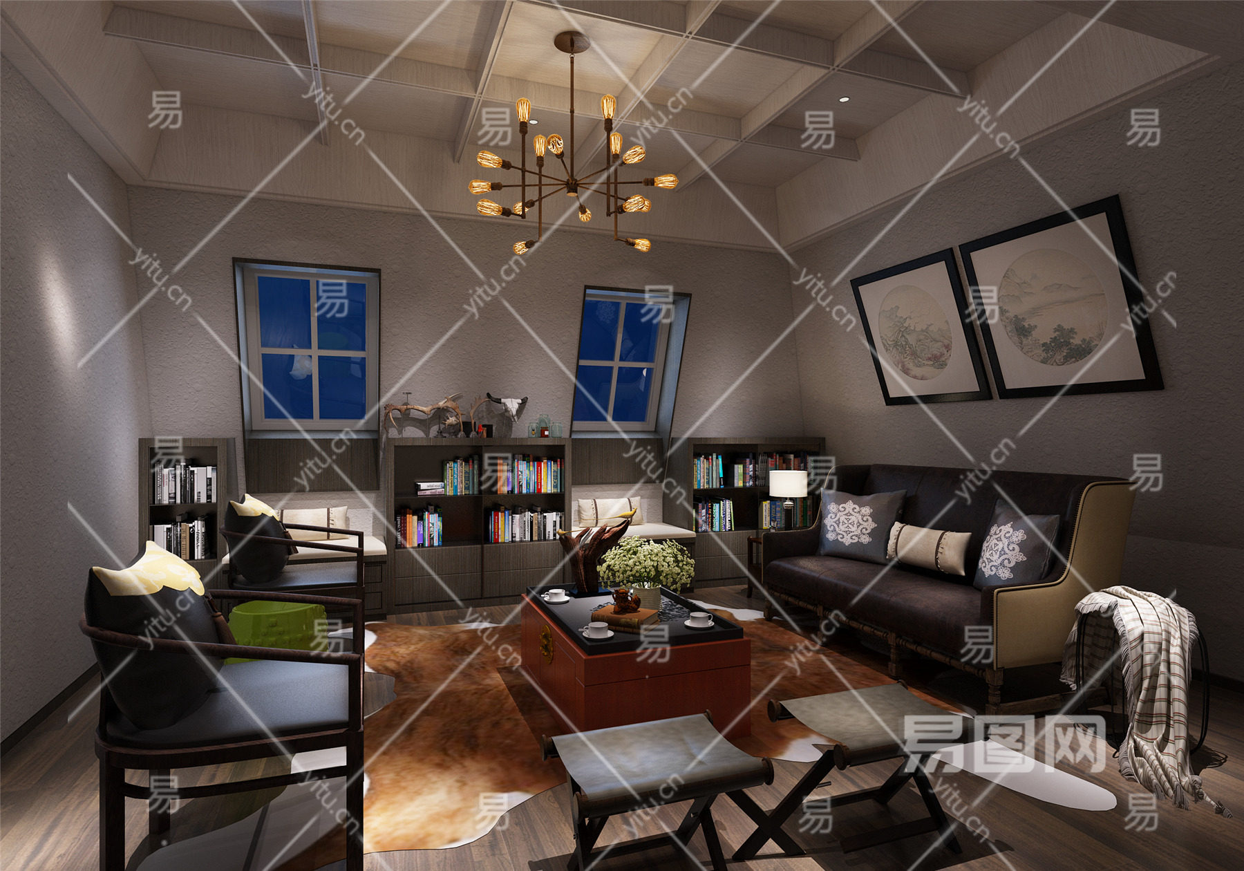 当前的位置:首页 > 3D模型 > 家装空间 > 书房 > 新中式小客厅 吊灯 书 摆件 画