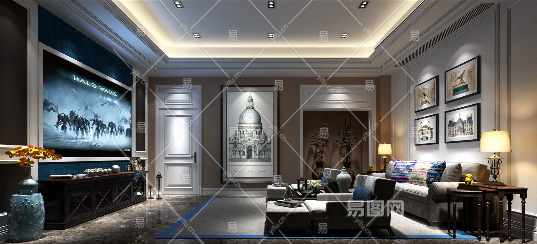 美式影音室 娱乐室 沙发 电影沙发 装饰画 投影 电视柜
