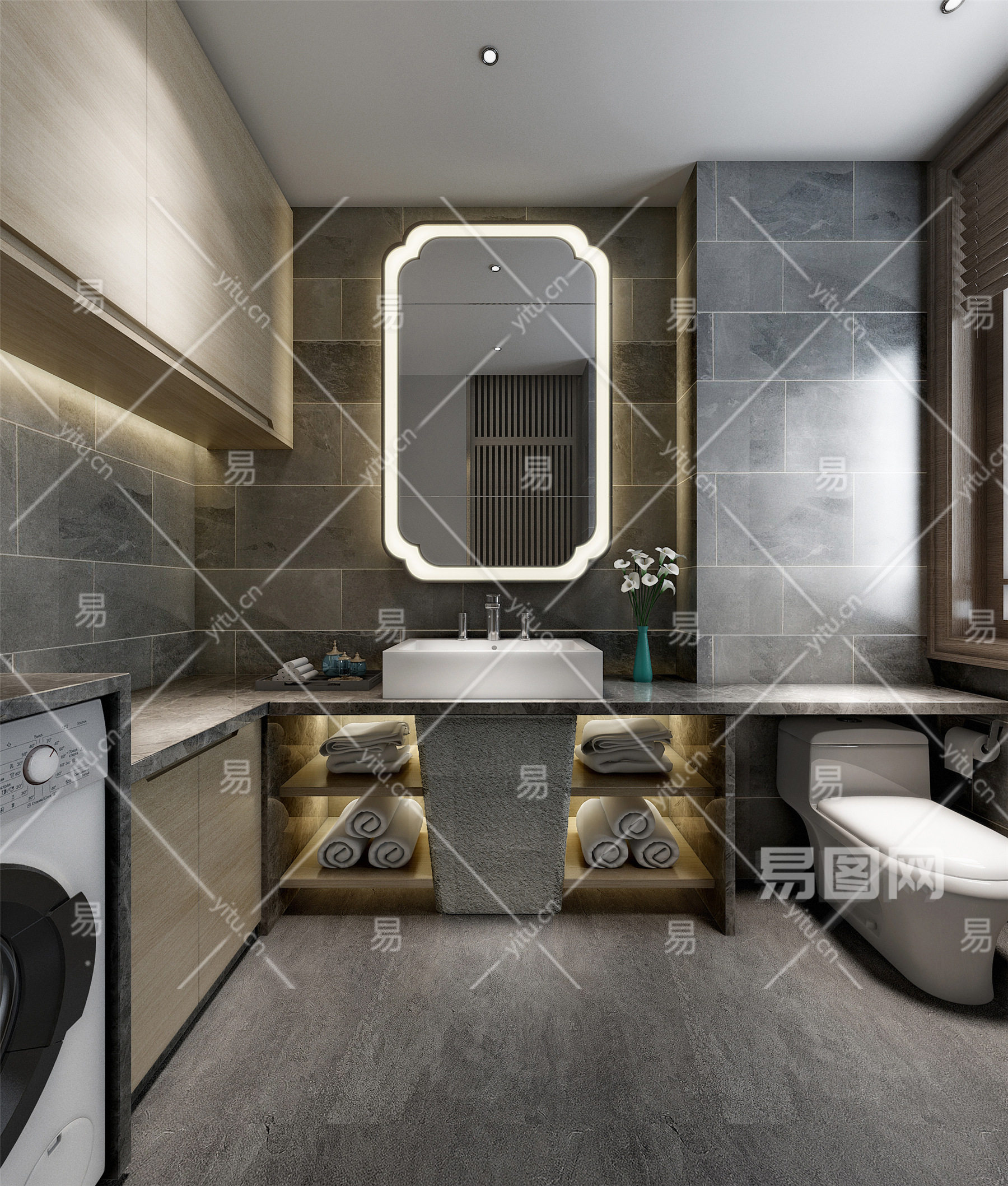 新中式卫生间 浴柜 坐厕 储物柜 洗衣机 镜子 摆件