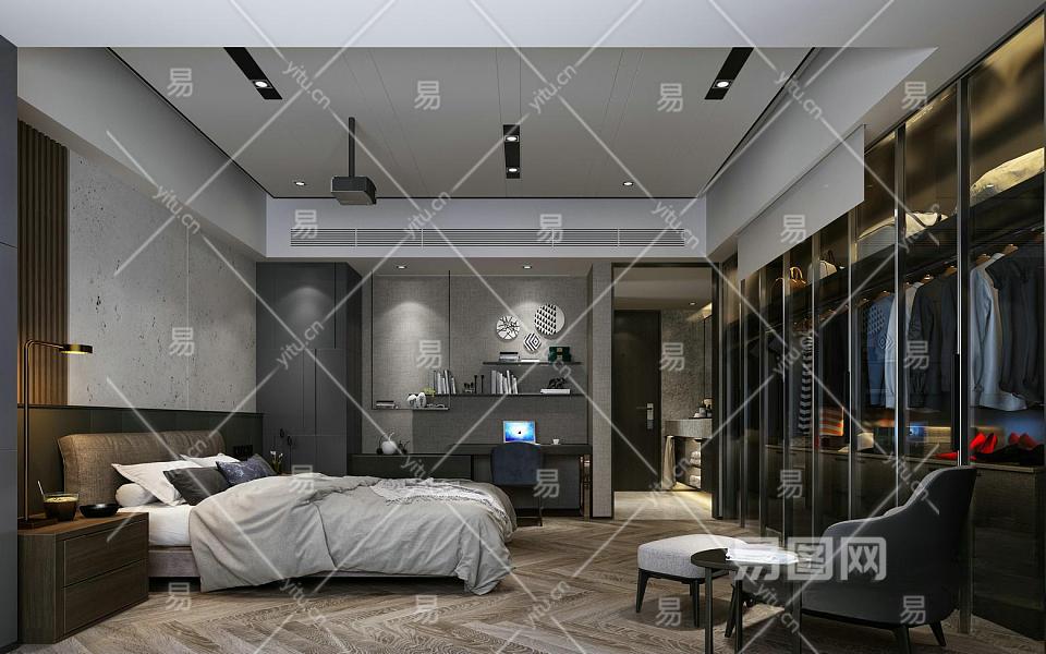 现代卧室 书桌椅组合 休闲椅 床头柜 衣柜 双人床 抱枕