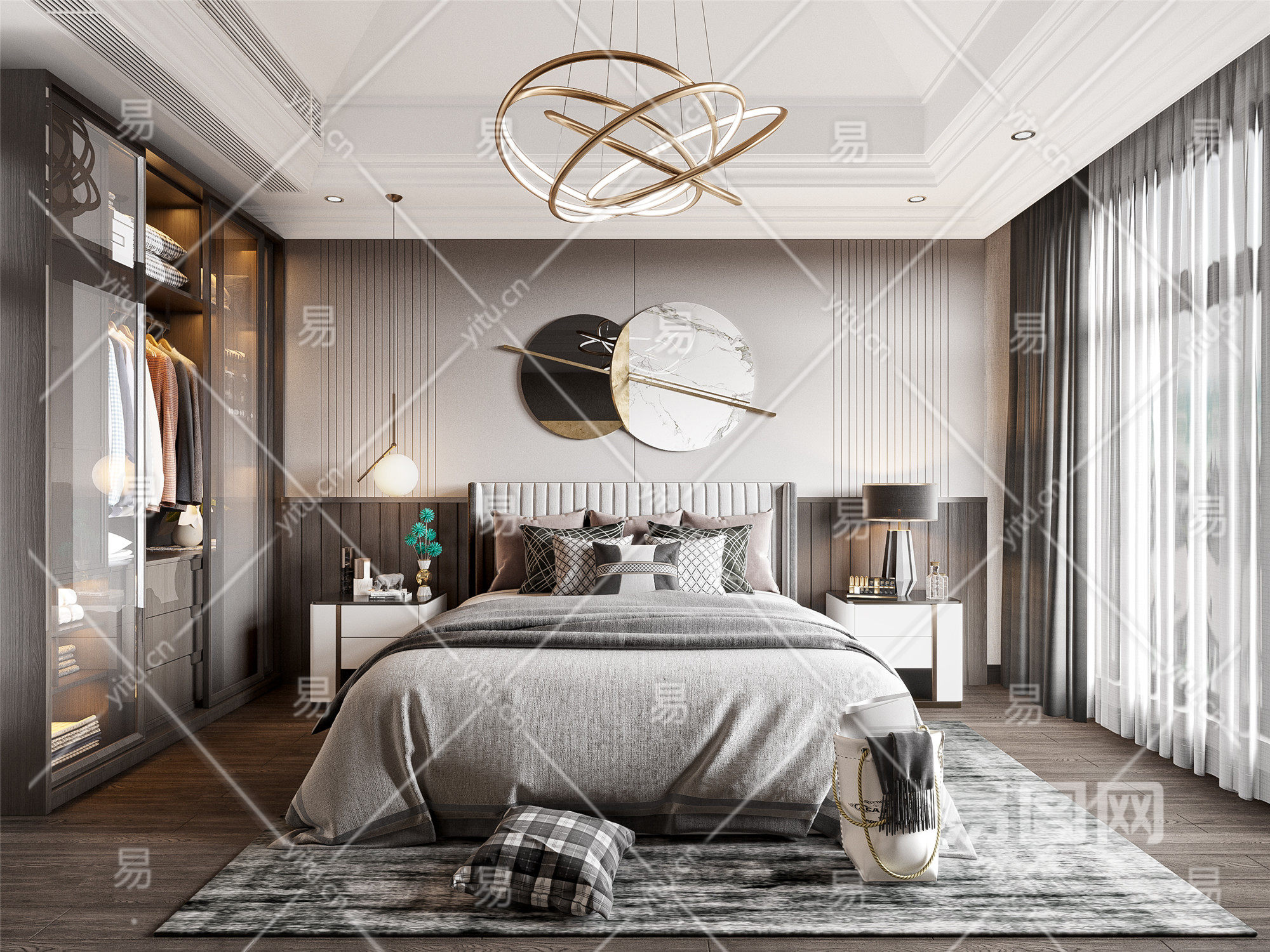 现代卧室 床 衣柜 装饰挂件 窗帘 木地板