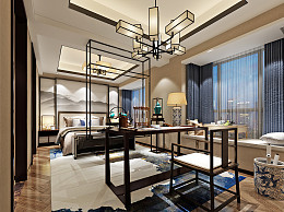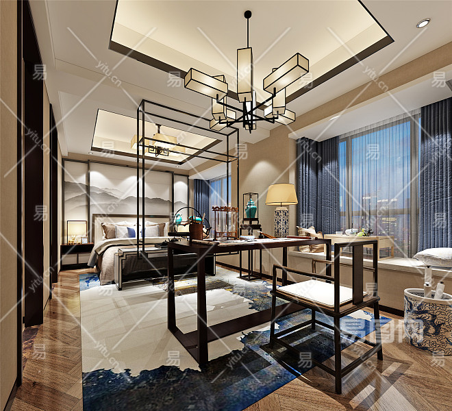 新中式卧室 双人床 床品 床头柜 吊灯 地毯