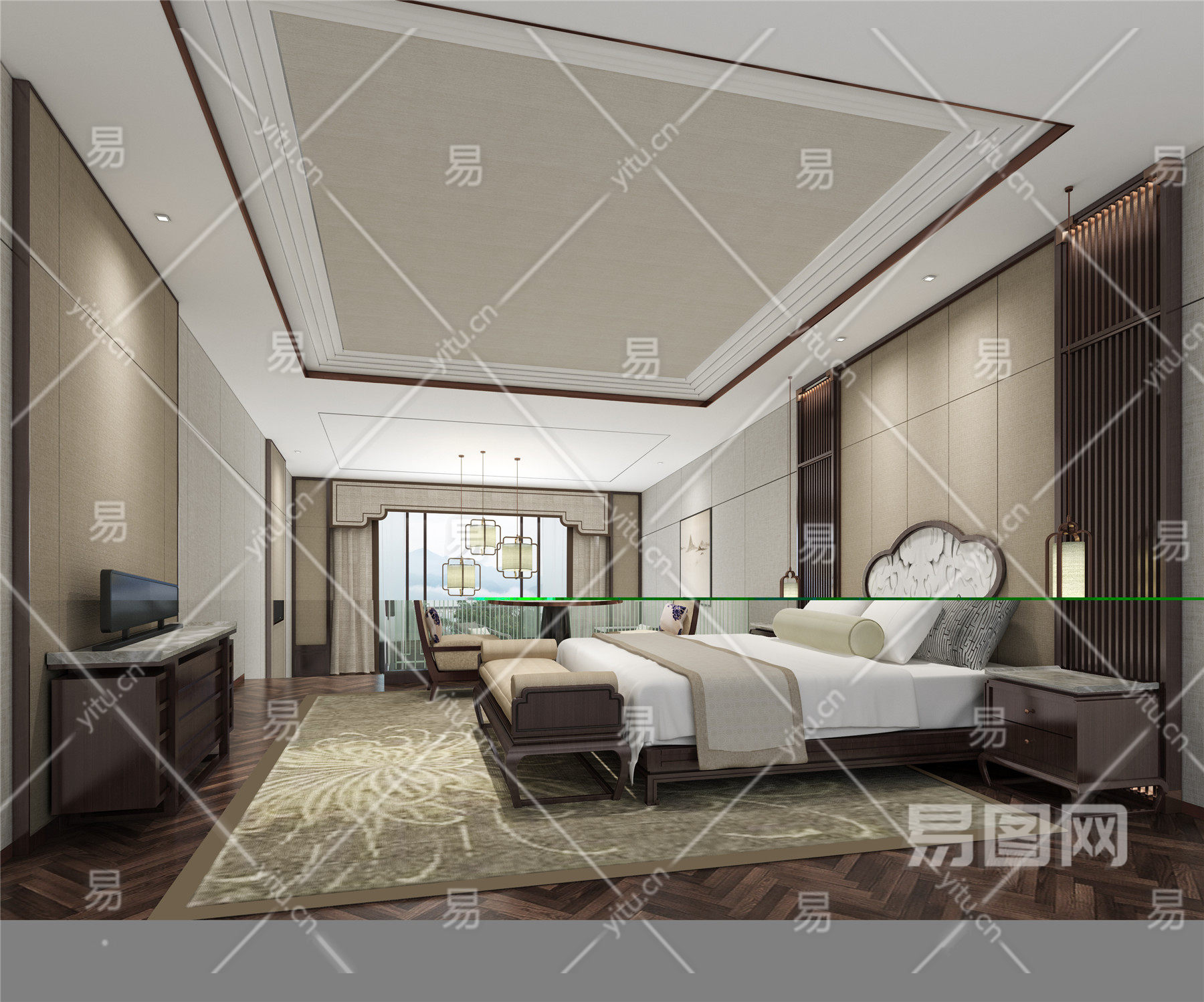 新中式卧室 床 床头柜 电视柜