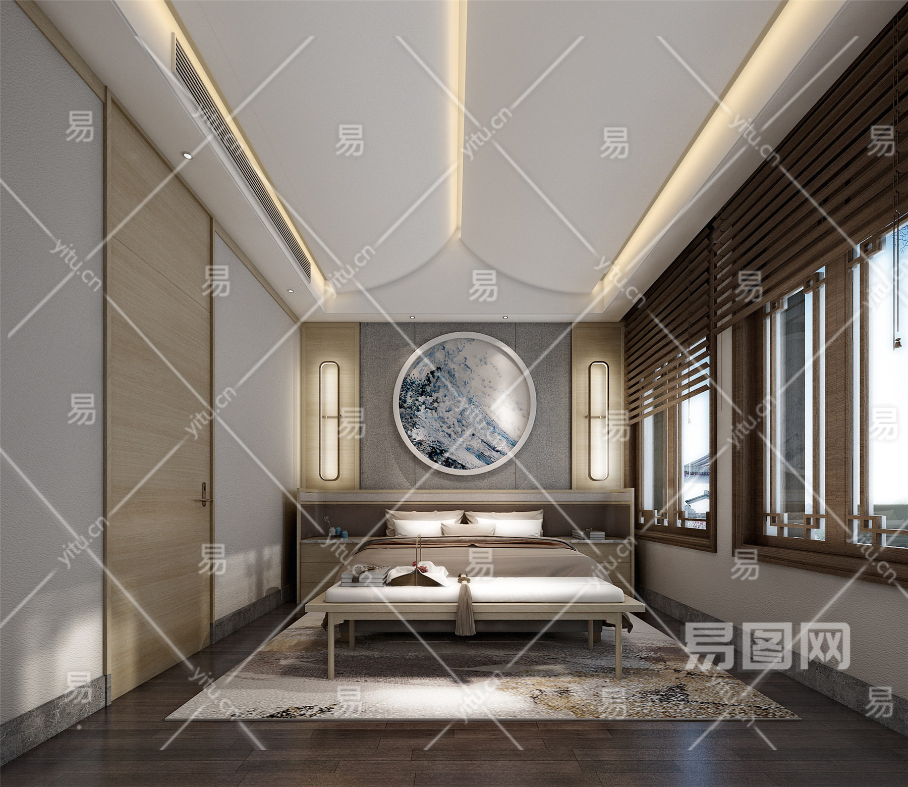 新中式卧室 中式客房 双人床 装饰画 百叶帘