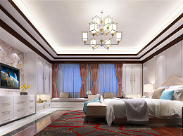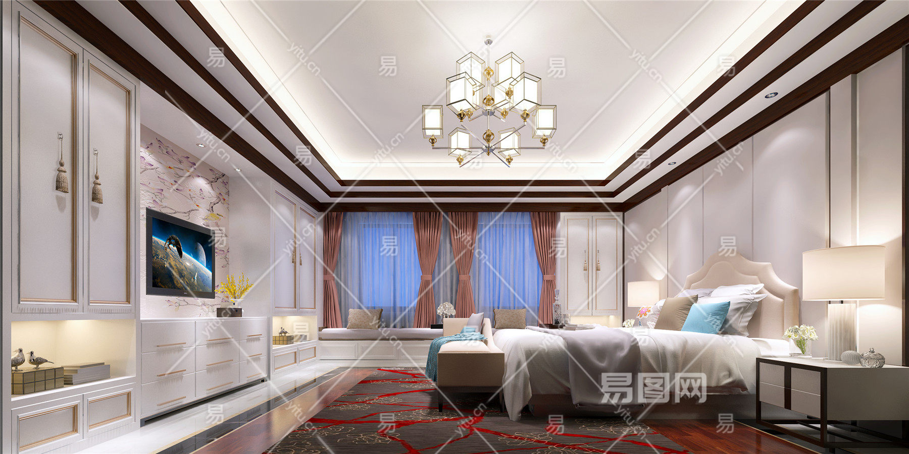 新中式卧室女儿房 吊灯 双人床 床头柜 衣柜