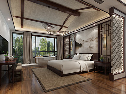 当前的位置:首页 > 3D模型 > 酒店空间 > 客房 > 新中式酒店 客房 双人床 背景墙 浴缸 书桌 造型吊灯