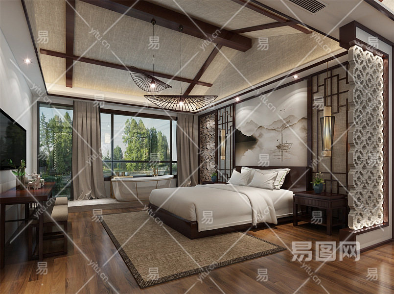 新中式酒店 客房 双人床 背景墙 浴缸 书桌 造型吊灯