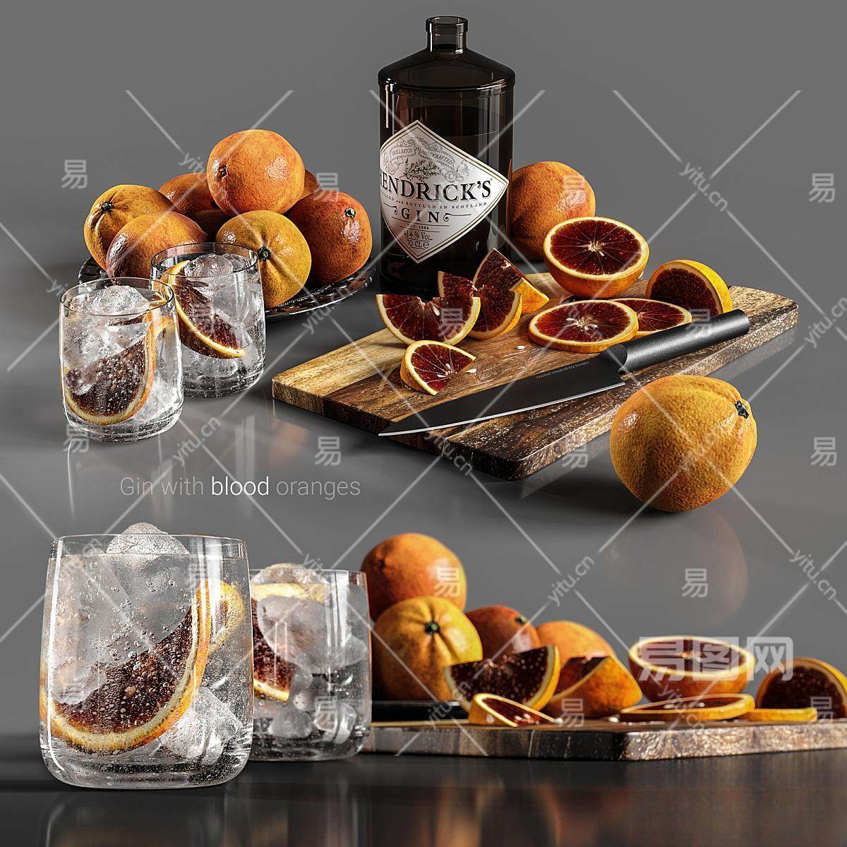 现代水果 餐厅摆件 橘子 酒杯 食物 酒瓶