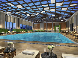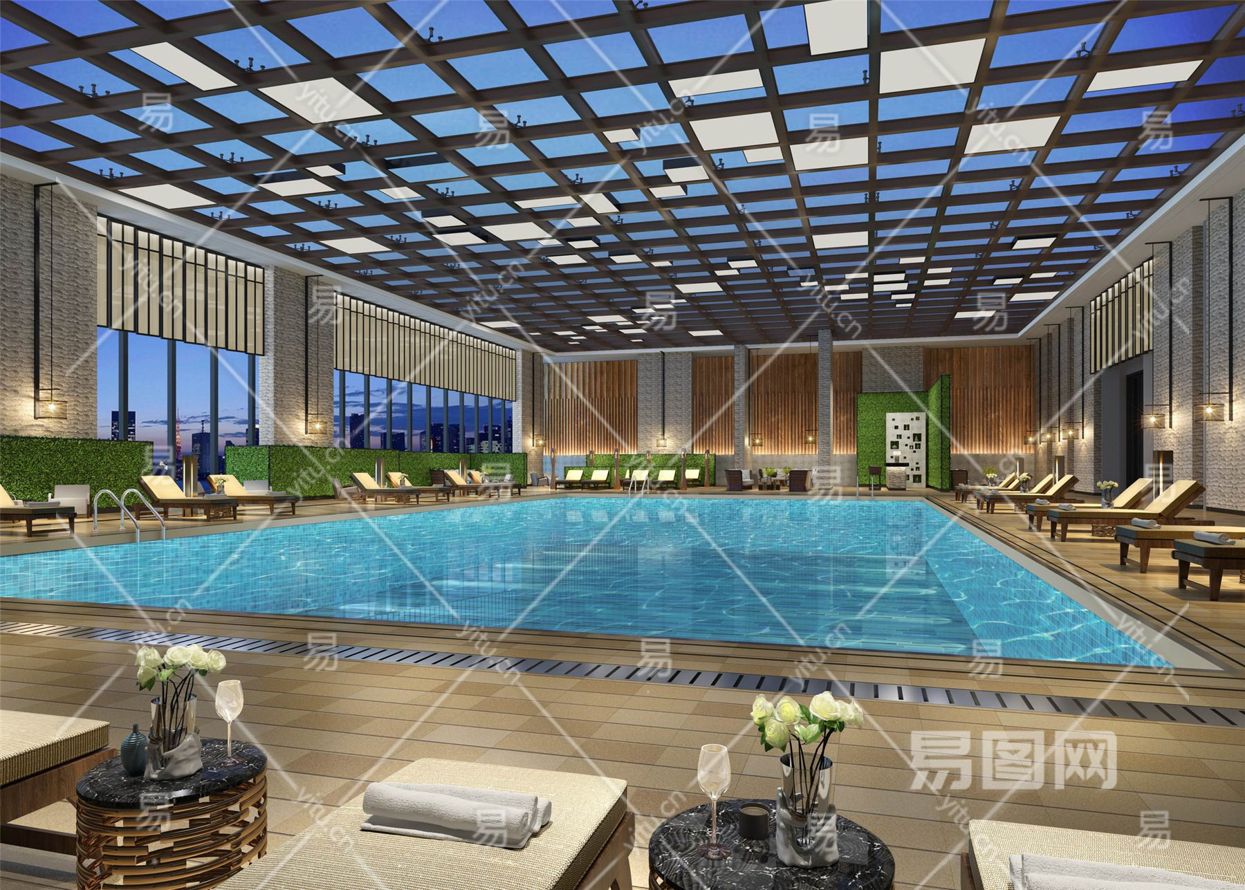 新中式游泳馆 休闲椅 大型水池 阳光房吊顶 吧台 躺椅