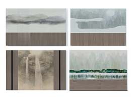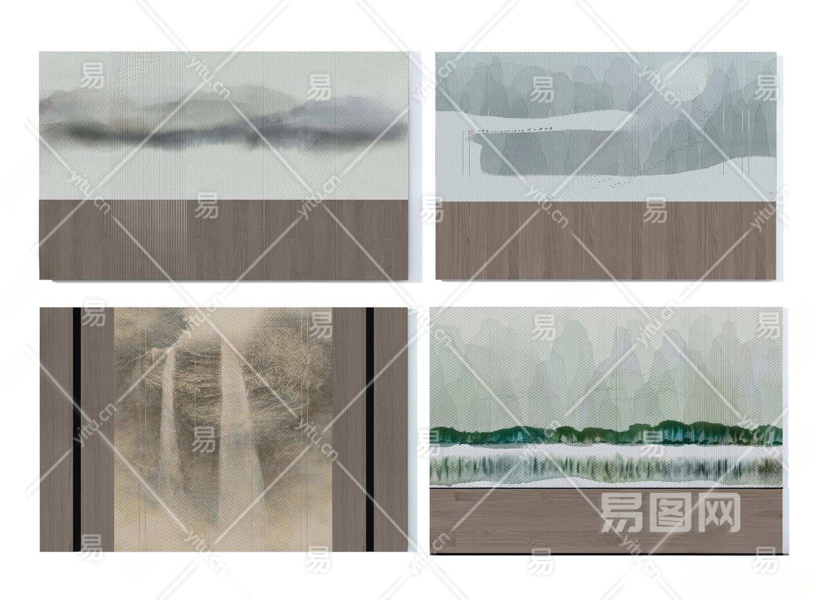 新中式灰绿色意境山水背景墙组合3D模型下载