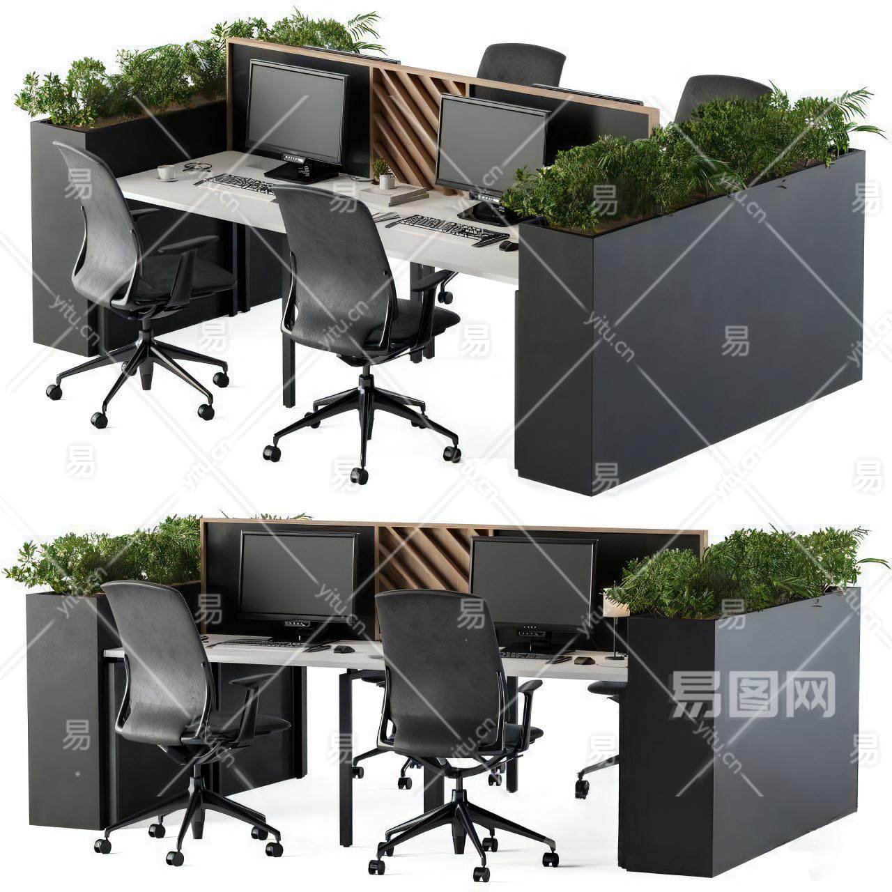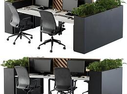 现代办公桌椅组合 单元格 办公椅 办公桌 植物花槽 电脑键盘 显示器