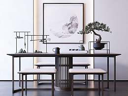 新中式茶桌椅植物摆件组合3D模型下载