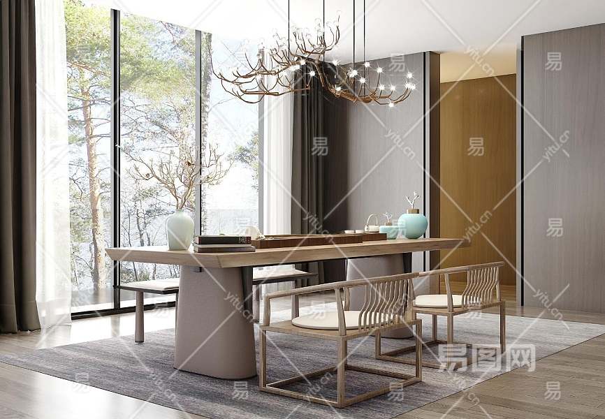 新中式禅意茶桌椅吊灯茶具饰品组合3D模型下载