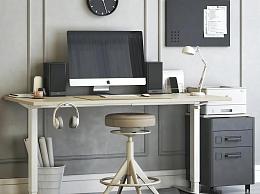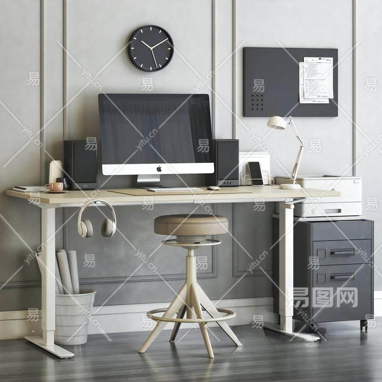 现代书桌椅 办公用品 显示器 耳机 台灯 柜子 吧凳 音响