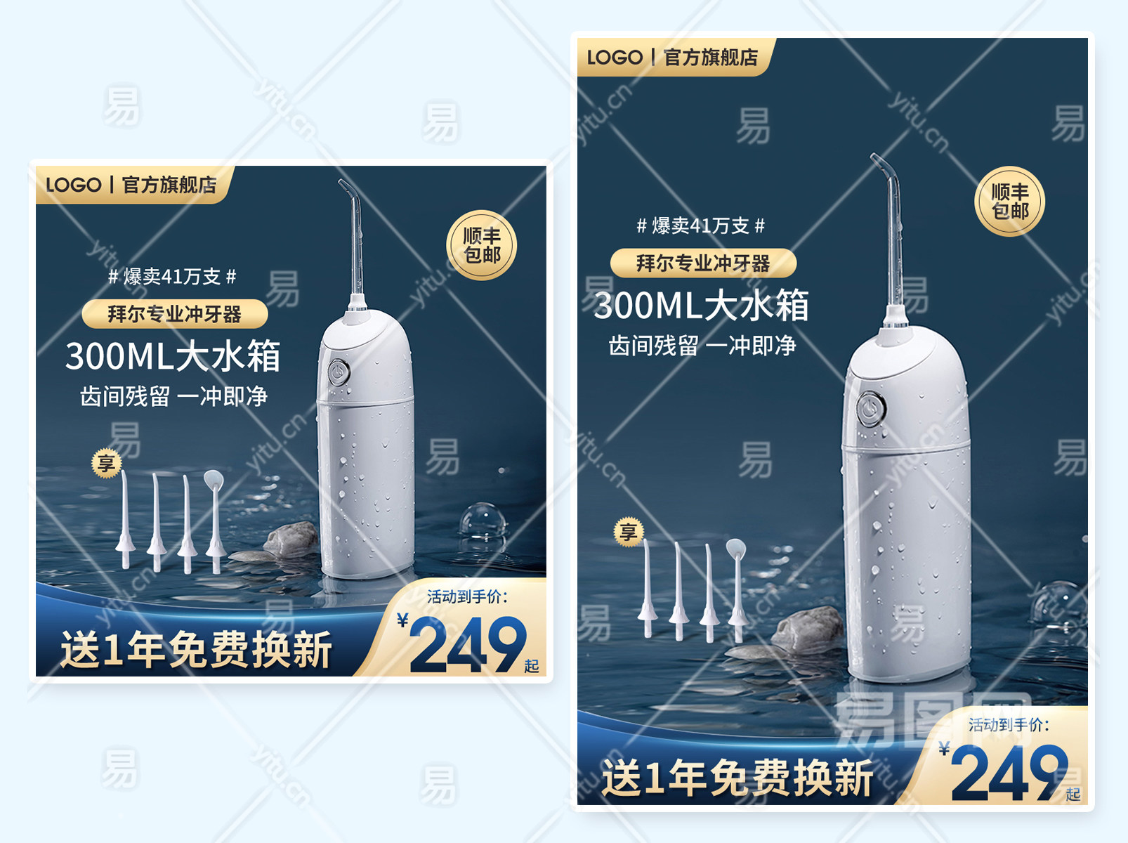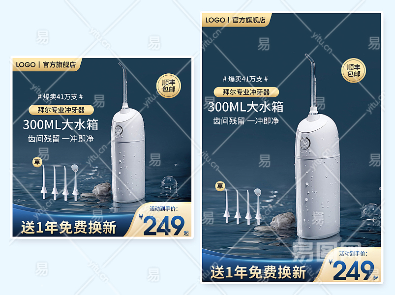 当前的位置:首页 > 广告设计 > 电商海报 > 日用百货 > 深蓝色简约拜尔专业冲牙器刷头顺丰包邮免费换新电器主图直通车
