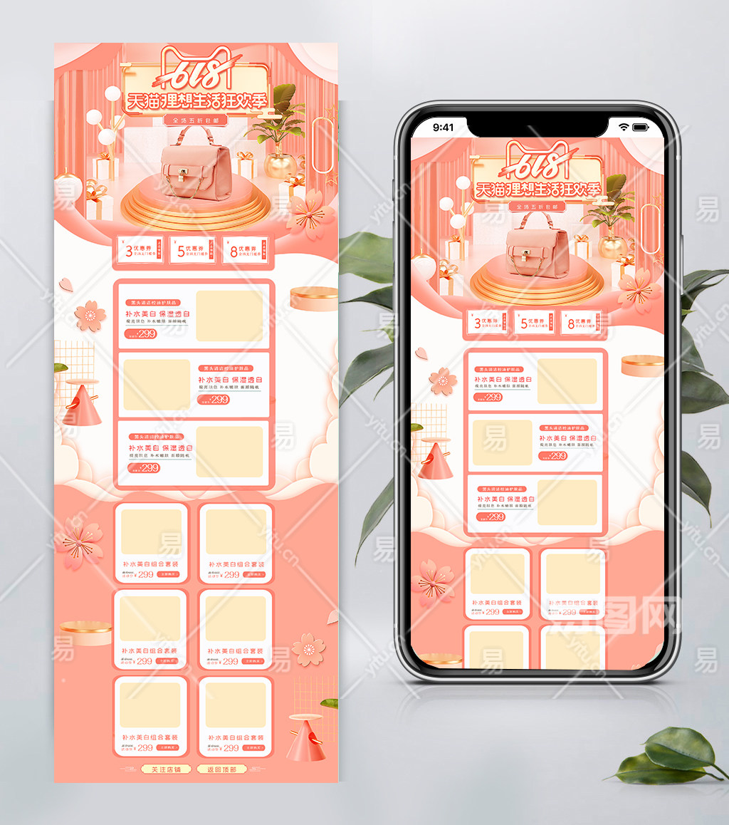 橘粉立体C4D618年中大促箱包电商首页